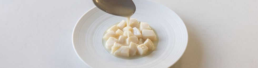 First cut some scallops in 8 even pieces and place them in a bowl. Now mix the tiger milk and submerge the scallops completely. Let this marinade for 1 hour in your fridge. You can precut the scallops, but marinating I would really recommend on doing just before serving. After that cover the bottom of a glass or bowl with a big scoop of the scallops and pour two table spoons of the tiger milk on top. Also season it with some flaky salt. Then you can finish the dish anyway you like. Bon appetit!
